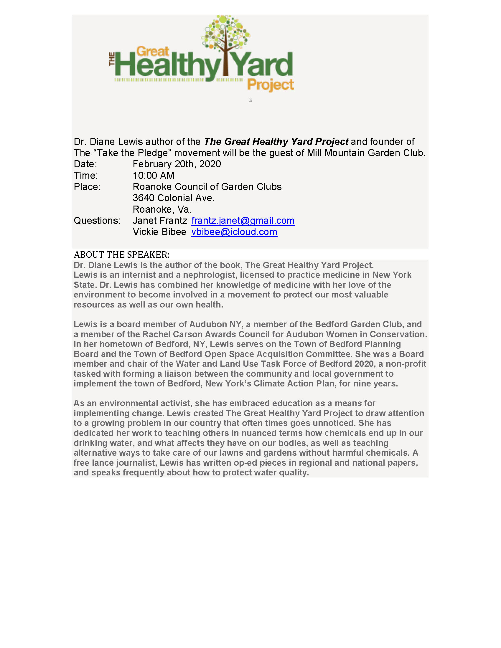 Diane Lewis, Author of The Great Healthy Yard Project Speaks at Mill Mountain Garden Club